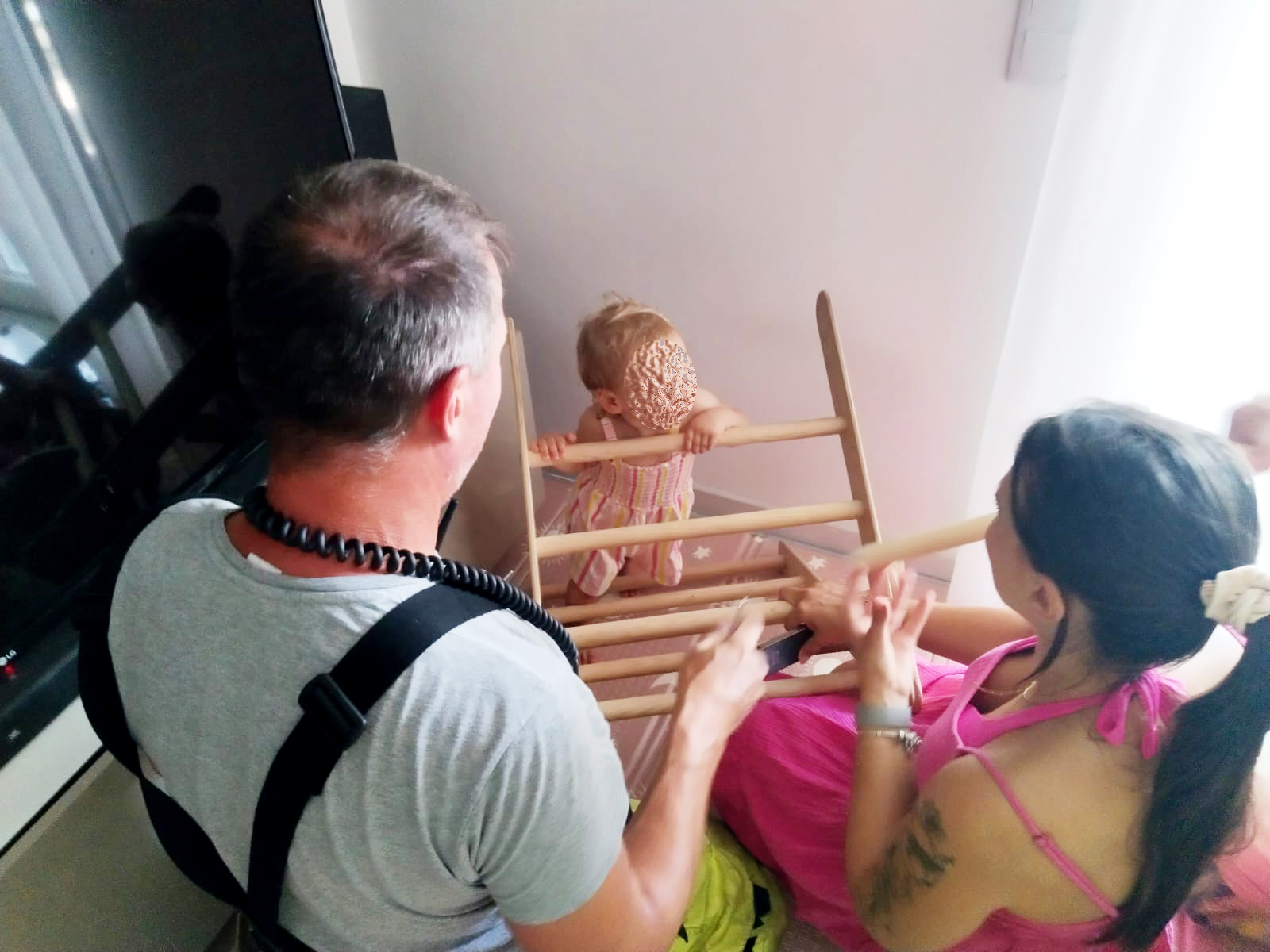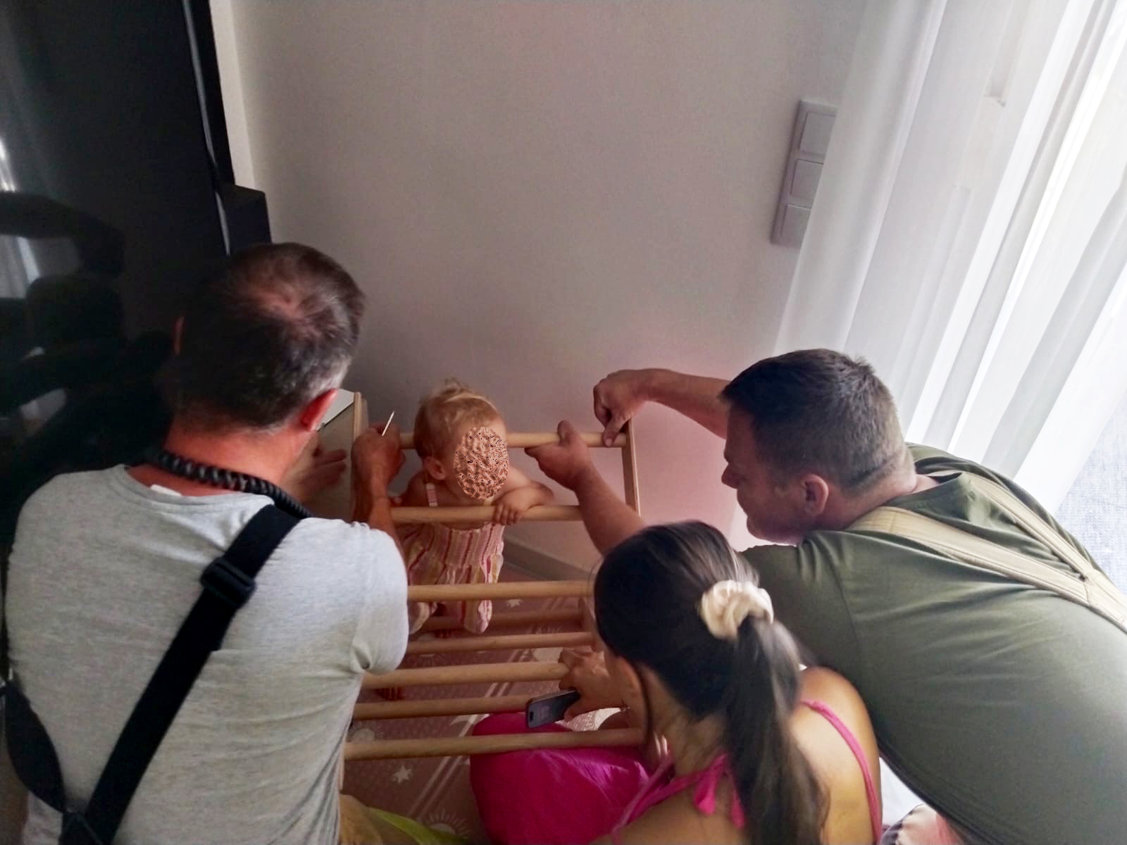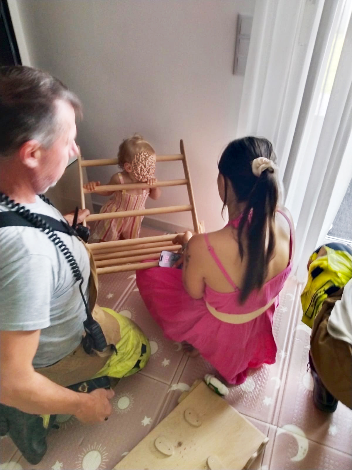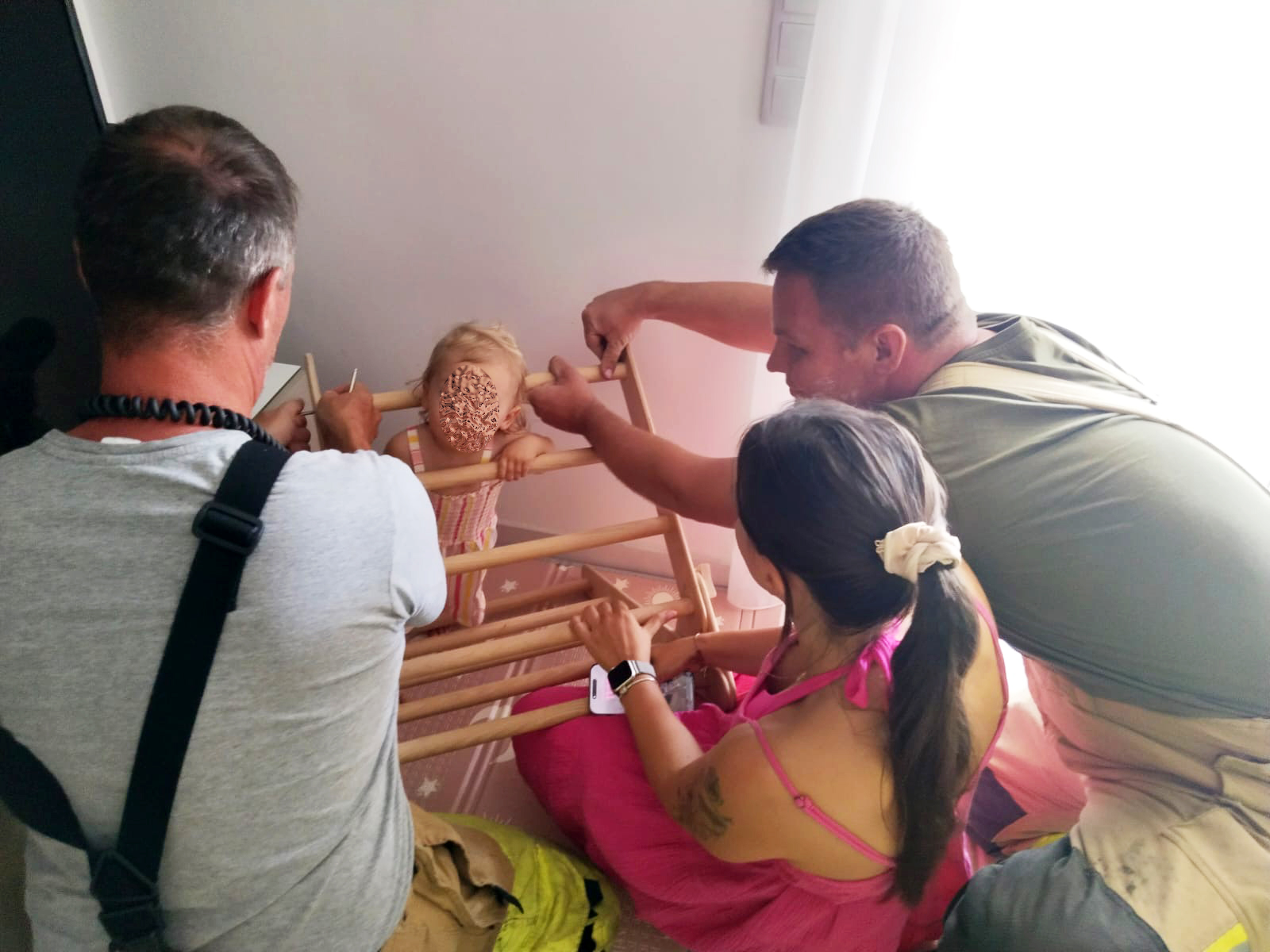 Als die Feuerwehr eintraf, bot sich ihnen folgende Situation: Ein rund 1,5 Jahre altes Mädchen war beim Spielen mit einem Holz-Kletterdreieck mit dem Kopf zwischen die Sprossen geraten und konnte sich nicht mehr selbst befreien.