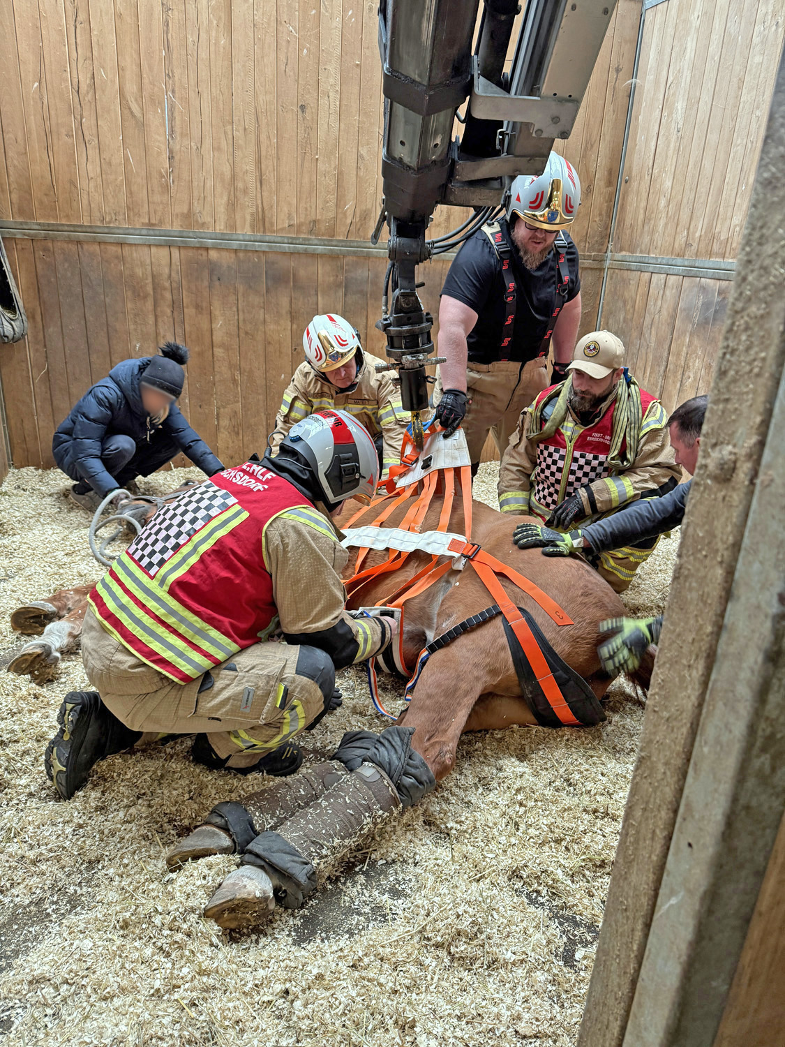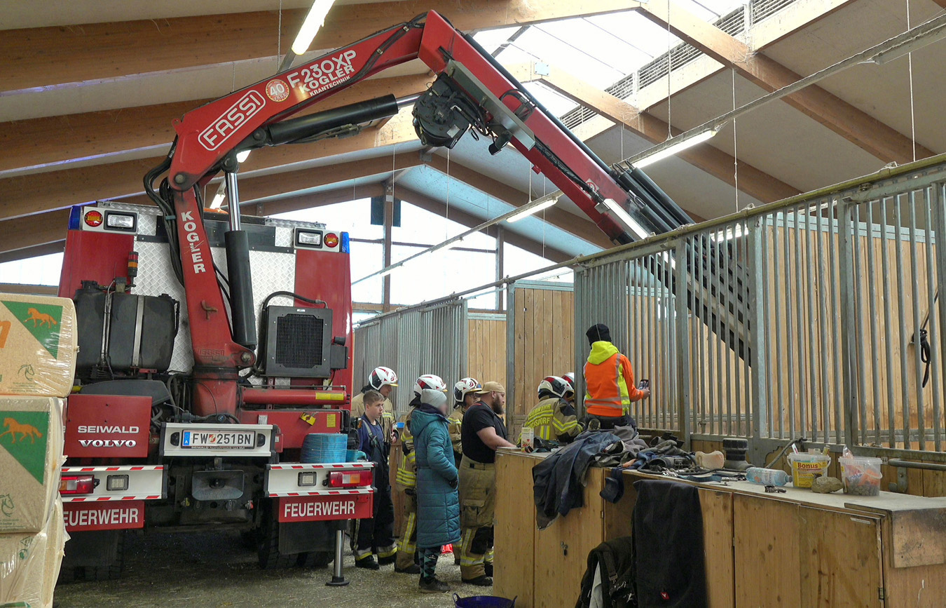 An der Einsatzstelle, in einem der zahlreichen Ställe am Magna-Racino Gelände, wurden sie von den Meldern erwartet. Das eigentlich schon „Senior-Pferd“ lag in einer der Boxen am Boden und auch die Tierärztin war anwesend. Einsatzleiter Kommandant Michael Ditzer sprach sich mit der Ärztin ab wie sie vorgehen werden. In diesem Fall entschied man, aufgrund der örtlichen Gegebenheiten, diese „Aufstehhilfe“ mit einem speziellen Großtier-Hebegeschirr und dem Ladekran des Schweren Rüstfahrzeuges durchzuführen.