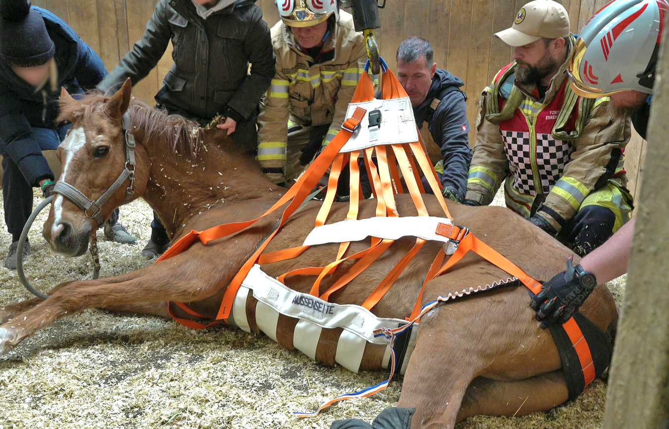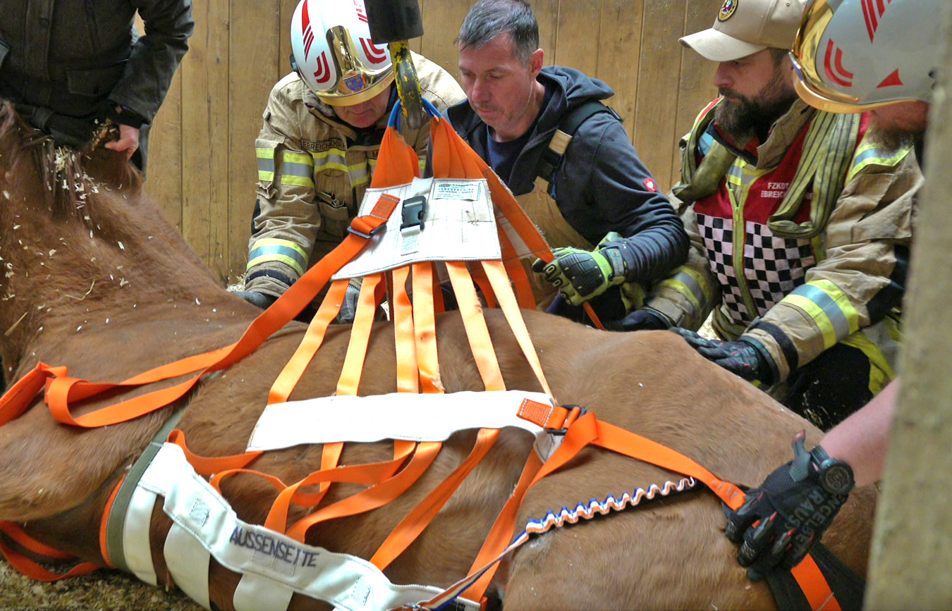 Erst nach einem zweiten Versuch gelang es das Großtier-Hebegeschirr unter bzw. am Pferd komplett zu montieren, um den „betagten Patienten“ wieder auf die Beine zu bekommen.
