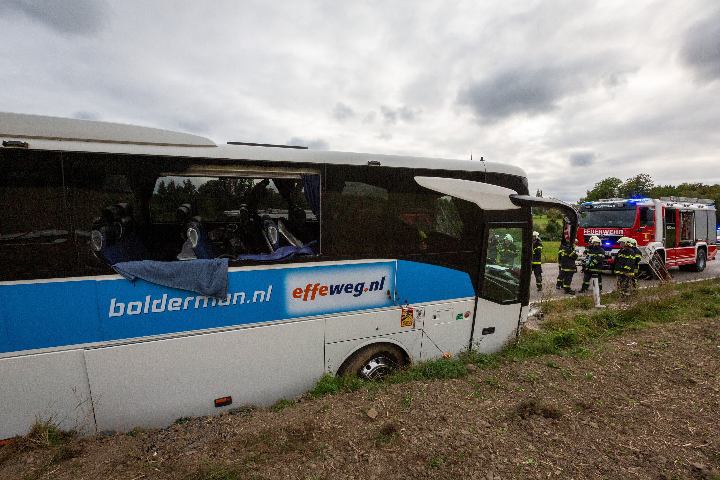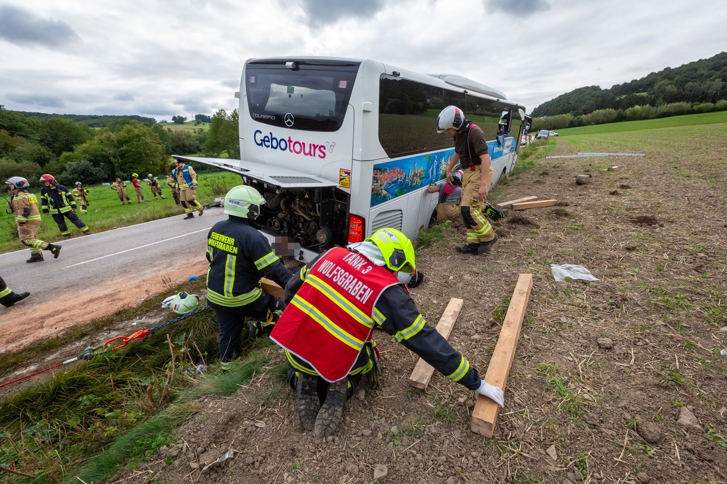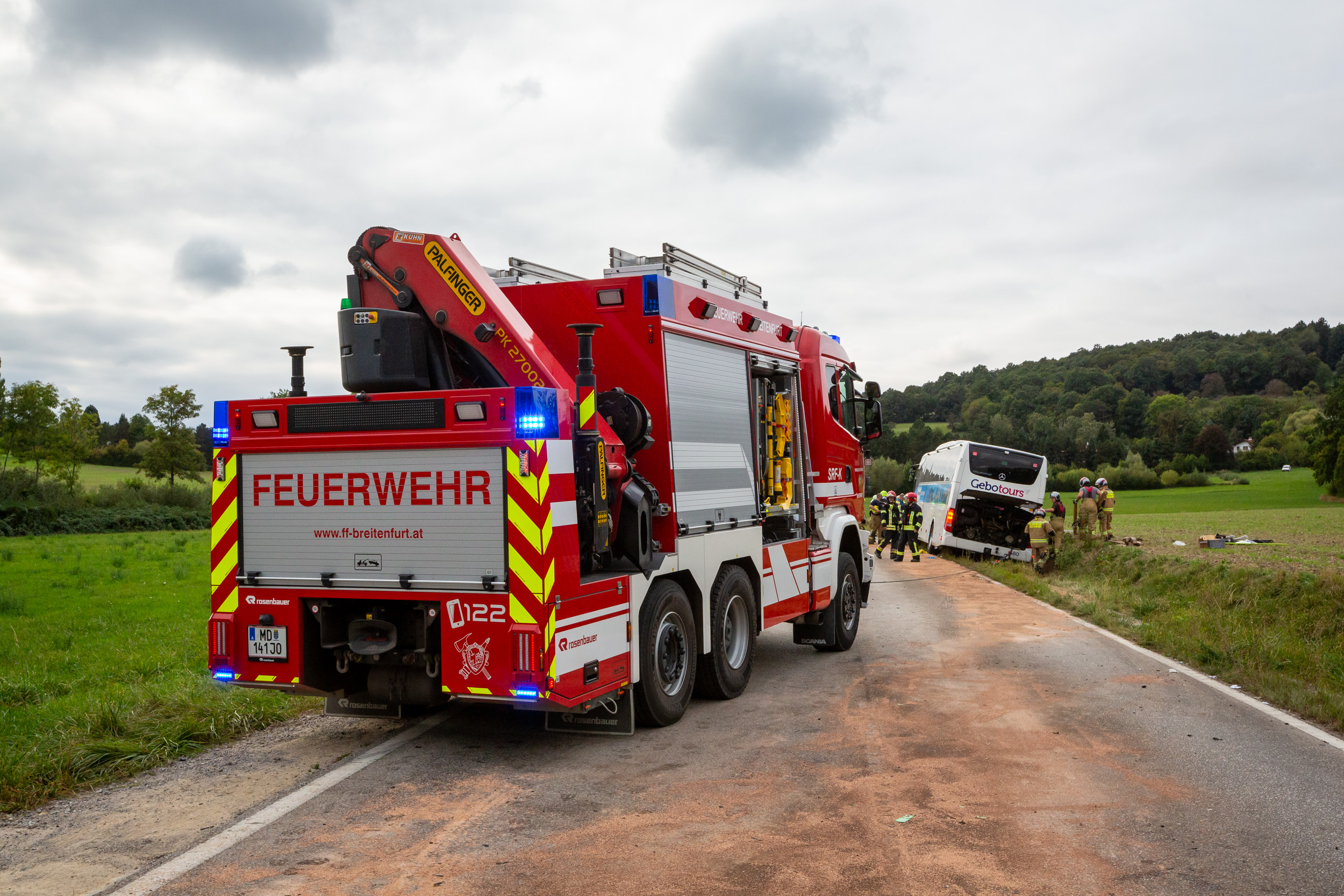 Die Freiwilligen Feuerwehren Laab im Walde, Breitenfurt und Wolfsgraben (Bezirk St. Pölten-Land) wurden gegen 16:00 Uhr zur Menschenrettung alarmiert; das Ausmaß des Unfalls war zu diesem Zeitpunkt noch nicht bekannt. Einsatzleiter Markus Wagner (Kommandant der FF Laab) erkundete die Einsatzstelle und teilte die Aufgaben beim Pkw sowie beim Bus ein.