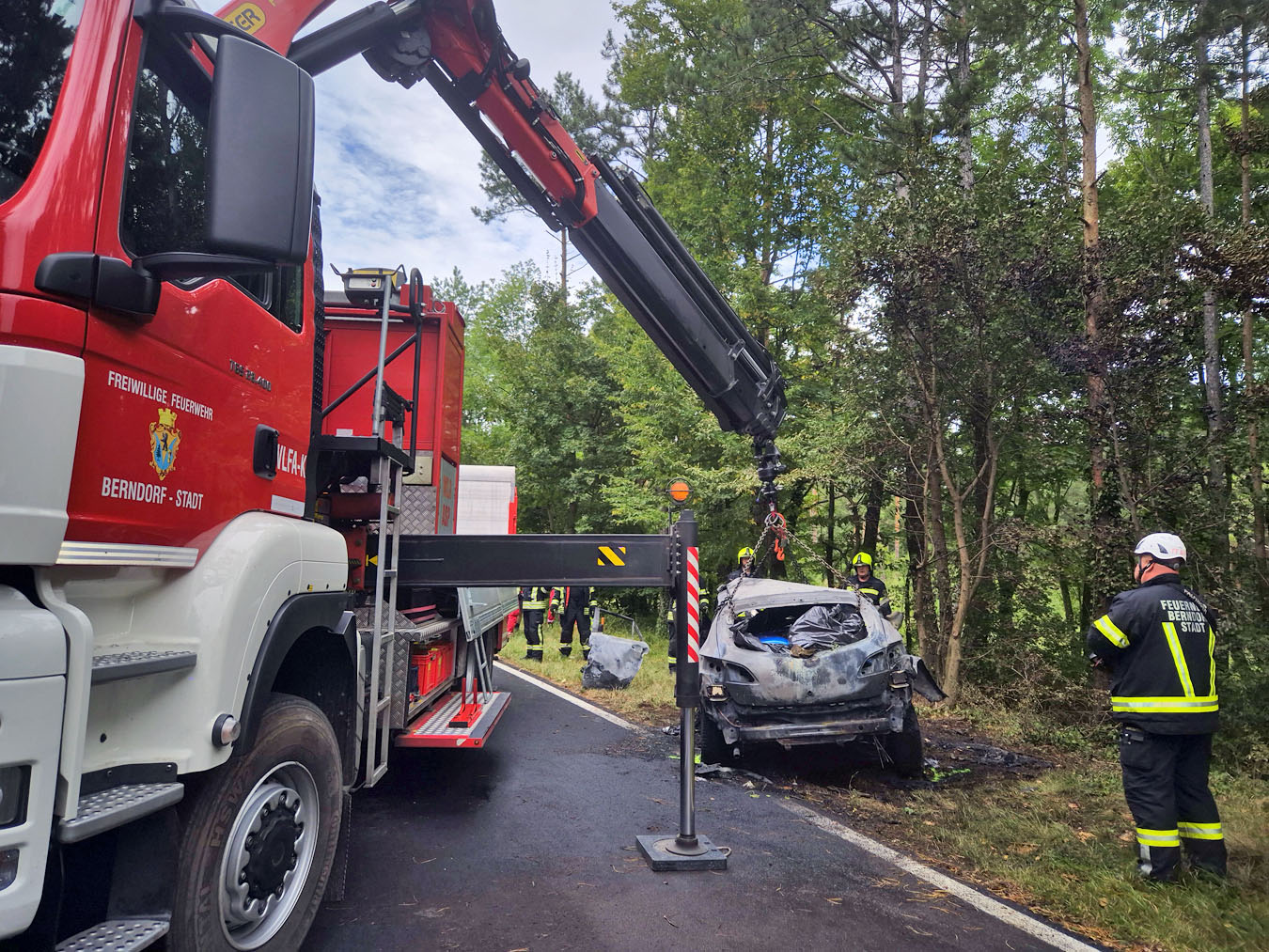 Nach polizeilicher Aufnahme und Freigabe wurde der Leichnam geborgen und das ausgebrannte Unfallwrack mit dem nachgeforderten Wechselladefahrzeug-Kran der FF Berndorf-Stadt geborgen, sowie die Fahrbahn von Trümmerteilen befreit bzw. gereinigt.
