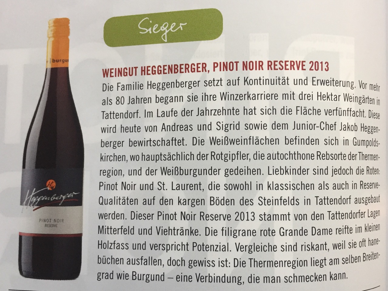 Ebenso erhielt der Pinot Noir 2013 Reserve des Weinguts Heggenbergers diese Höchstwertung. Er ist mit dieser Wertung der einzige Pinot Noir, der die Höchstnote erhalten hat und gilt somit als bester Pinot Noir Österreichs.